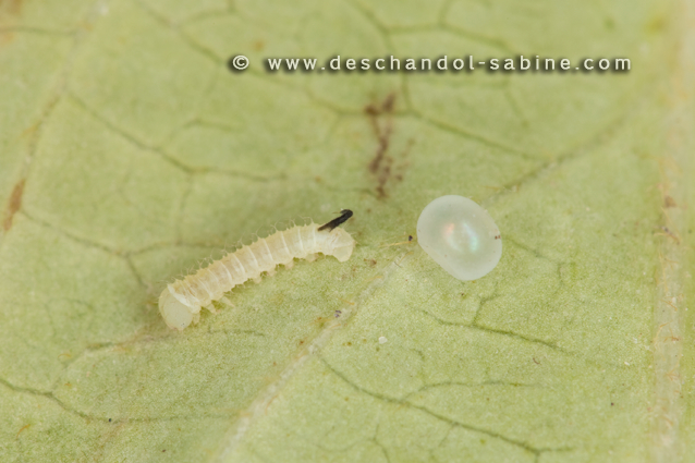 : Sphinx-Gazé (Hemaris fuciformis), chenille 1er stade, Bubikon, Suisse.