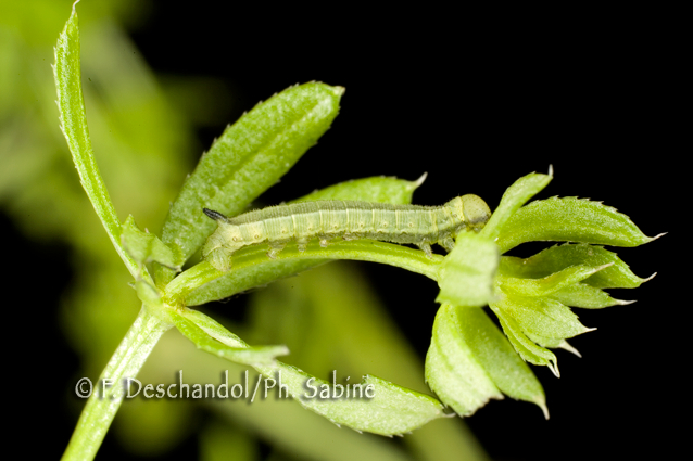: Sphinx de la Garance (Hyles gallii), chenille 2ème stade, forme verte, Krusne Hory, Vykmanov, République Tchèque.