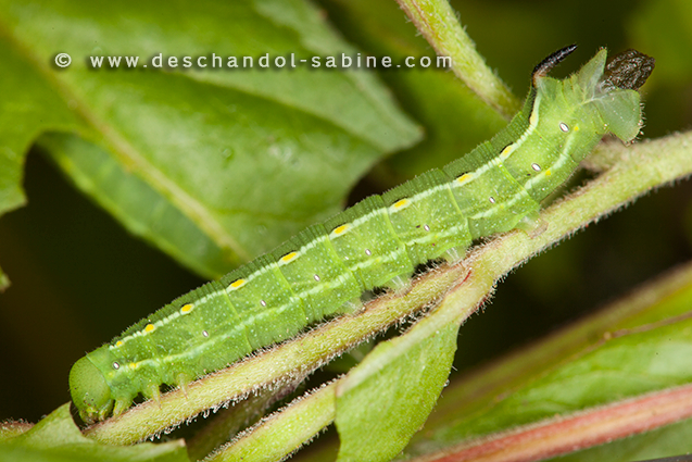 : Sphinx de la Garance (Hyles gallii), chenille 3ème stade, forme verte, Mellby Torp, Öland, Suède.