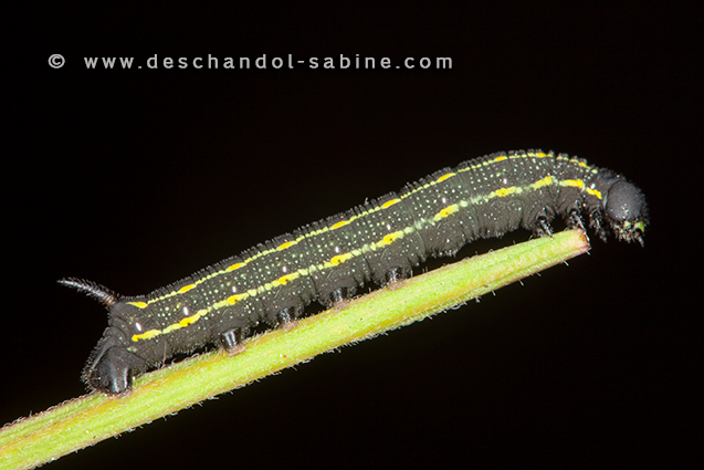 : Sphinx de la Garance (Hyles gallii), chenille 3ème stade, forme sombre, Mellby Torp, Öland, Suède.