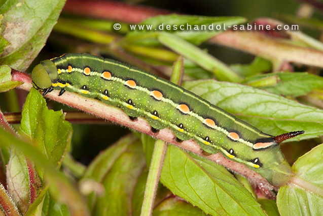 : Sphinx de la Garance (Hyles gallii), chenille 4ème stade, forme verte, Mellby Torp, Öland, Suède.
