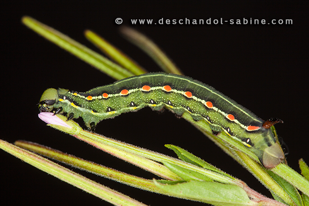 : Sphinx de la Garance (Hyles gallii), chenille 4ème stade, forme verte, Mellby Torp, Öland, Suède.
