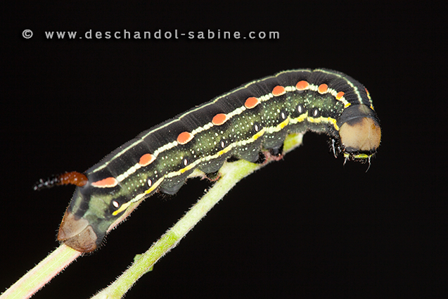 : Sphinx de la Garance (Hyles gallii), chenille 4ème stade, forme intermédiaire, Mellby Torp, Öland, Suède.