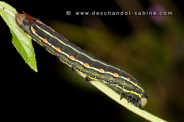: Sphinx de la Garance (Hyles gallii), chenille 4ème stade, forme intermédiaire, Mellby Torp, Öland, Suède.