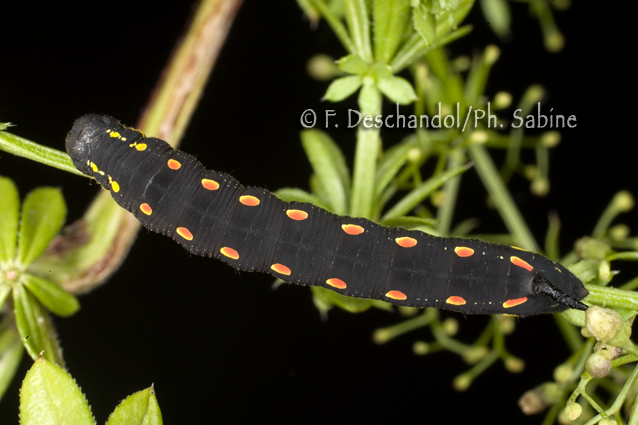: Sphinx de la Garance (Hyles gallii), chenille 4ème stade, forme sombre, Krusne Hory, Vykmanov, République Tchèque.