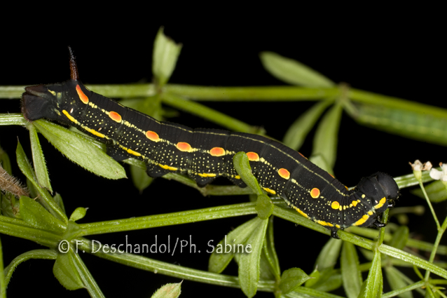 : Sphinx de la Garance (Hyles gallii), chenille 4ème stade, forme sombre, Krusne Hory, Vykmanov, République Tchèque.