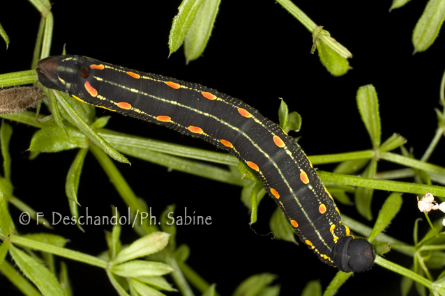 : Sphinx de la Garance (Hyles gallii), chenille 4ème stade, forme sombre, Krusne Hory, Vykmanov, République Tchèque.