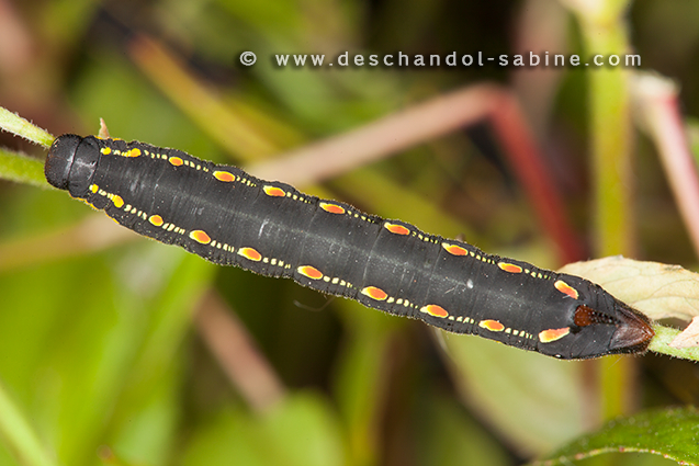 : Sphinx de la Garance (Hyles gallii), chenille 4ème stade, forme sombre, Mellby Torp, Öland, Suède.