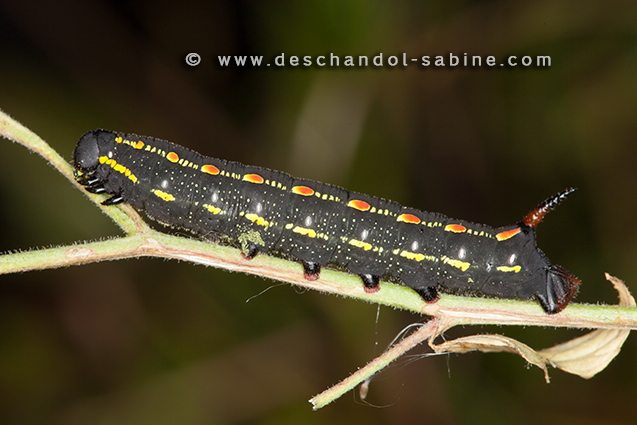 : Sphinx de la Garance (Hyles gallii), chenille 4ème stade, forme sombre, Mellby Torp, Öland, Suède.