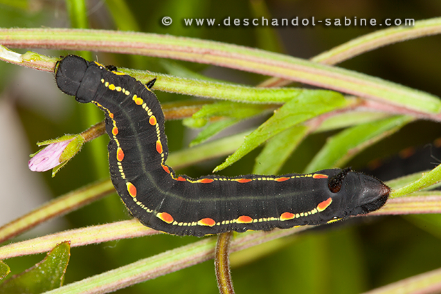 : Sphinx de la Garance (Hyles gallii), chenille 4ème stade, forme sombre, Mellby Torp, Öland, Suède.