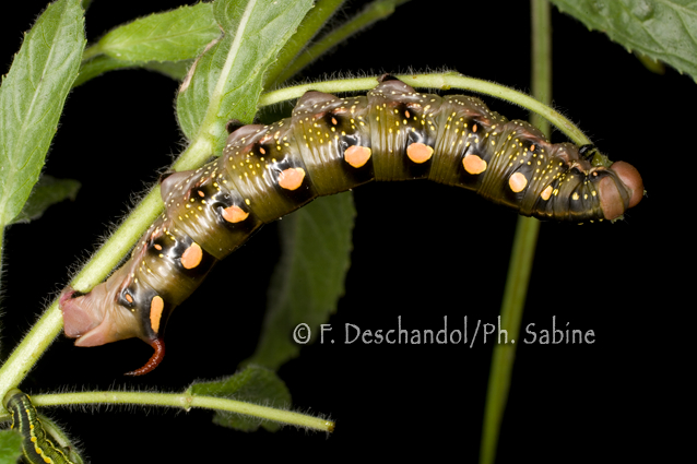 : Sphinx de la Garance (Hyles gallii), chenille 5ème stade, forme verte, Elevage.