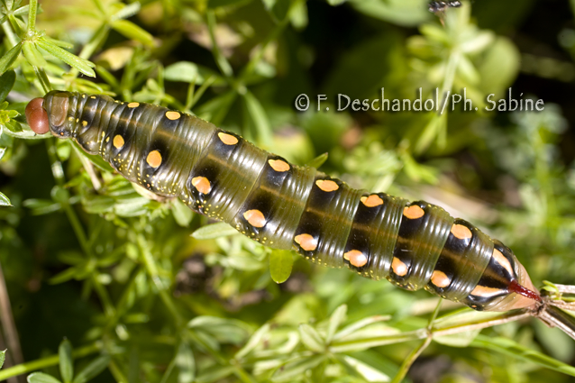 : Sphinx de la Garance (Hyles gallii), chenille 5ème stade, forme verte, Elevage.