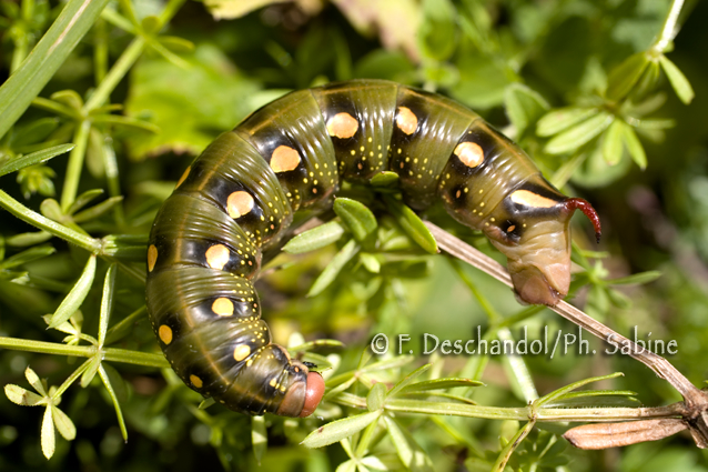 : Sphinx de la Garance (Hyles gallii), chenille 5ème stade, forme verte, Elevage.