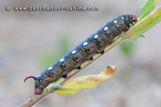: Sphinx de la Garance (Hyles gallii), chenille 5ème stade, forme intermédiaire, Mellby Torp, Öland, Suède.