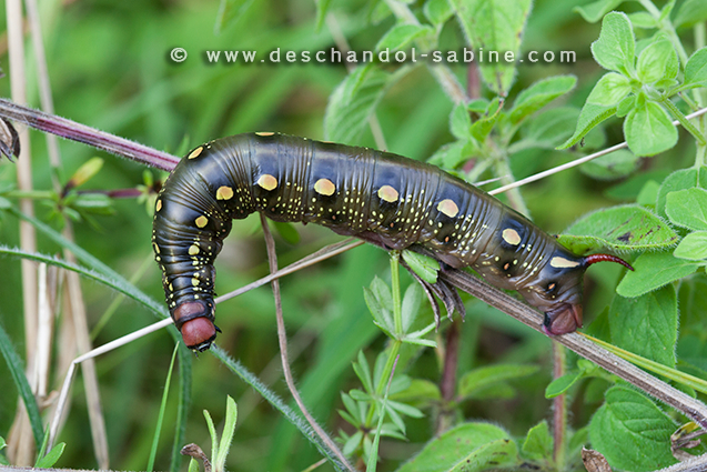 : Sphinx de la Garance (Hyles gallii), chenille 5ème stade, forme intermédiaire, Mellby Torp, Öland, Suède.
