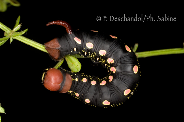 : Sphinx de la Garance (Hyles gallii), chenille 4ème stade, forme sombre, Elevage.
