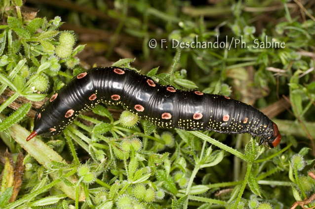 : Sphinx de la Garance (Hyles gallii), chenille 5ème stade, forme sombre, Krusne Hory, Vykmanov, République Tchèque.