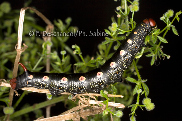 : Sphinx de la Garance (Hyles gallii), chenille 5ème stade, forme sombre, Krusne Hory, Vykmanov, République Tchèque.