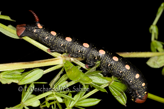 : Sphinx de la Garance (Hyles gallii), chenille 5ème stade, forme sombre, Krusne Hory, Vykmanov, République Tchèque.