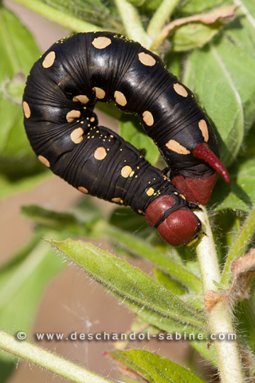 : Sphinx de la Garance (Hyles gallii), chenille 5ème stade, forme sombre, Mellby Torp, Öland, Suède.