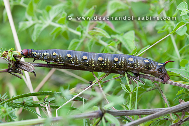 : Sphinx de la Garance (Hyles gallii), chenille 5ème stade, forme sombre, Mellby Torp, Öland, Suède.