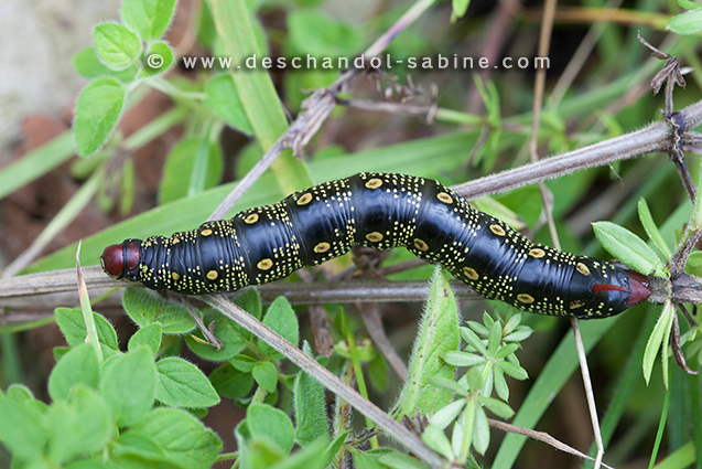 : Sphinx de la Garance (Hyles gallii), chenille 5ème stade, forme sombre, Mellby Torp, Öland, Suède.