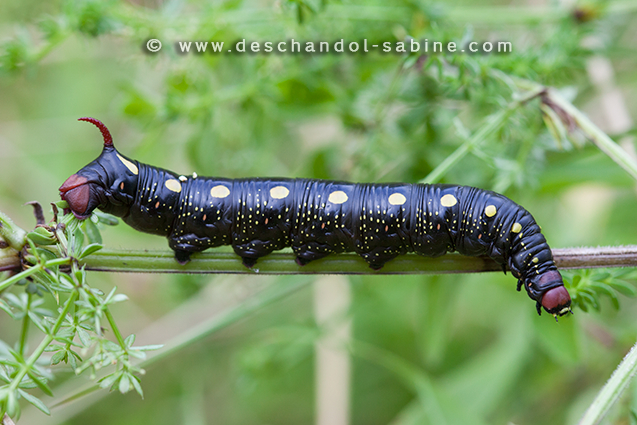 : Sphinx de la Garance (Hyles gallii), chenille 5ème stade, forme sombre, Mellby Torp, Öland, Suède.