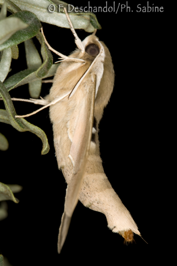 : Sphinx de l'Argousier (Hyles hippophaes hippophaes), femelle émettant ses phéromones, Crimée, Ukraine.