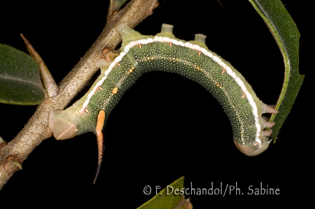 : Sphinx de l'Argousier (Hyles hippophaes hippophaes), chenille 5ème stade, Sud de la France.