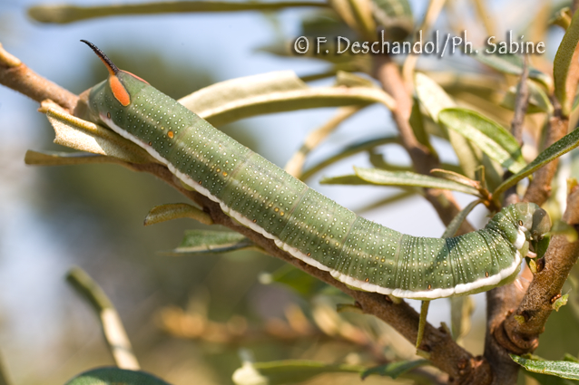 : Sphinx de l'Argousier (Hyles hippophaes hippophaes), chenille 5ème stade, Sud de la France.