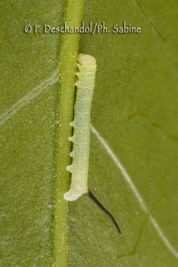 : Sphinx du Troène (Sphinx ligustri), chenille 1er stade, Beauvoir-sur-Mer (85), France.