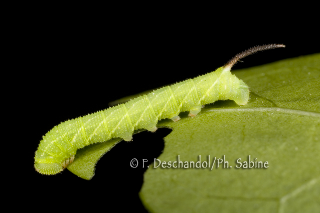 : Sphinx du Troène (Sphinx ligustri), chenille 2ème stade, Beauvoir-sur-Mer (85), France.