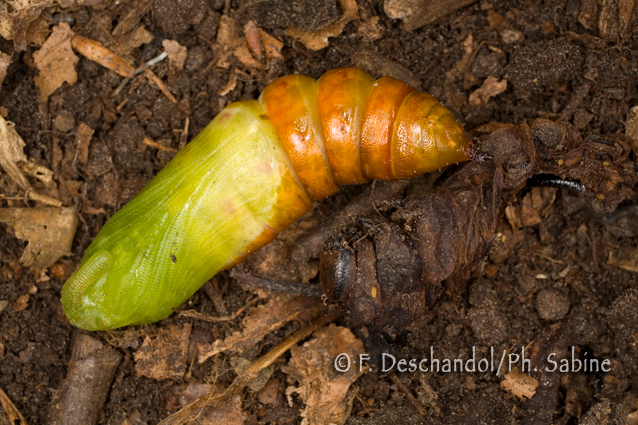 : Sphinx du Troène (Sphinx ligustri), chrysalide récente, Straubing, Bayern, Allemagne.