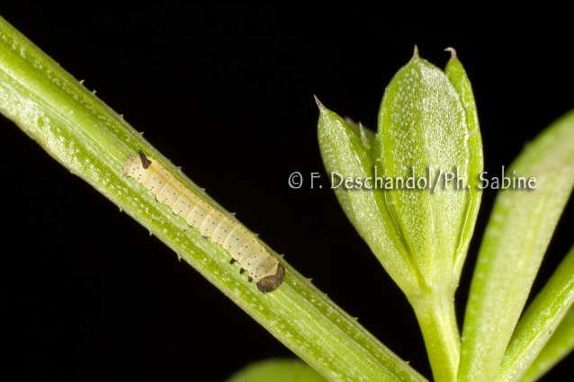 : Sphinx livournien (Hyles livornica), chenille 1er stade, Ténérife, Iles Canaries, Espagne.