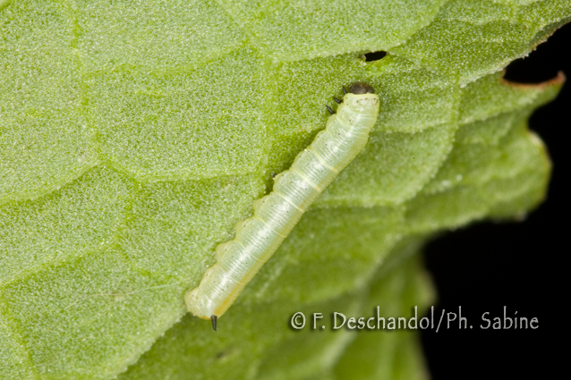 : Sphinx livournien (Hyles livornica), chenille 1er stade, Ténérife, Iles Canaries, Espagne.
