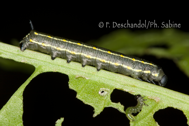 : Sphinx livournien (Hyles livornica), chenille 2ème stade, mue proche, Ténérife, Iles Canaries, Espagne.