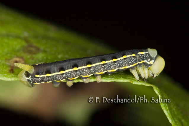 : Sphinx livournien (Hyles livornica), chenille 3ème stade après la mue, Ténérife, Iles Canaries, Espagne.