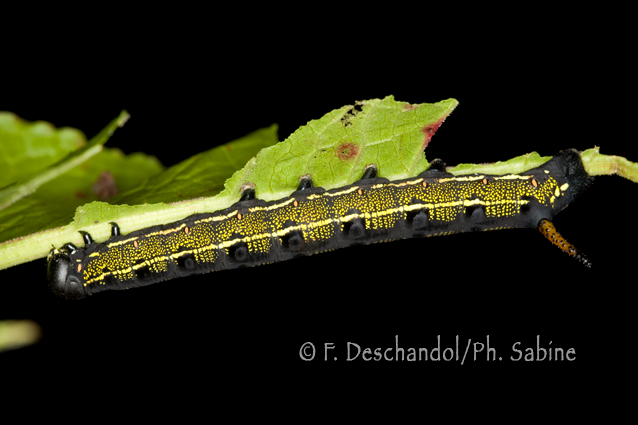 : Sphinx livournien (Hyles livornica), chenille 5ème stade, Ténérife, Iles Canaries, Espagne.
