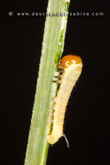 : Sphinx du Pin méridional (Sphinx maurorum), chenille 1er stade, Laplume (47), France.