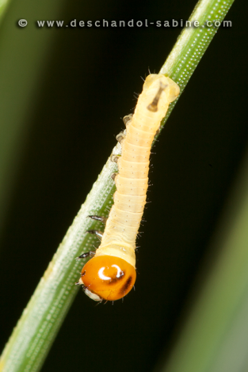 : Sphinx du Pin méridional (Sphinx maurorum), chenille 1er stade, Laplume (47), France.
