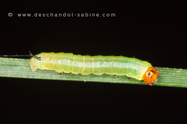 : Sphinx du Pin méridional (Sphinx maurorum), chenille 1er stade, Laplume (47), France.
