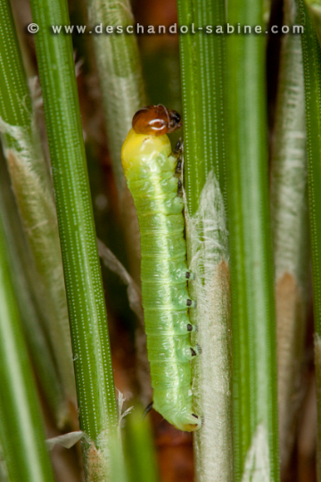: Sphinx du Pin méridional (Sphinx maurorum), chenille 1er stade, mue proche, Laplume (47), France.