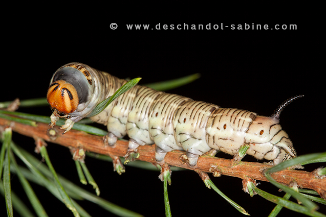 : Sphinx du Pin méridional (Sphinx maurorum), chenille 5ème stade, attitude de défense, Laplume (47), France.