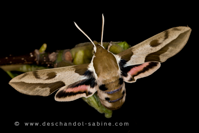 : Sphinx Nicéa (Hyles nicaea nicaea), mâle, posture d'intimidation, Carcassonne (11), France.