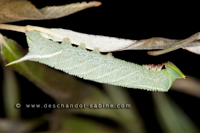 : Sphinx demi-paon (Smerinthus ocellatus ocellatus), chenille 4ème stade, mue proche, Garidech (31), France.