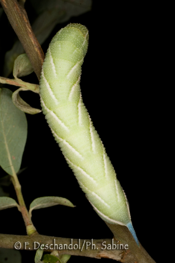 : Sphinx demi-paon (Smerinthus ocellatus ocellatus), chenille 5ème stade,Treillières (44), France.