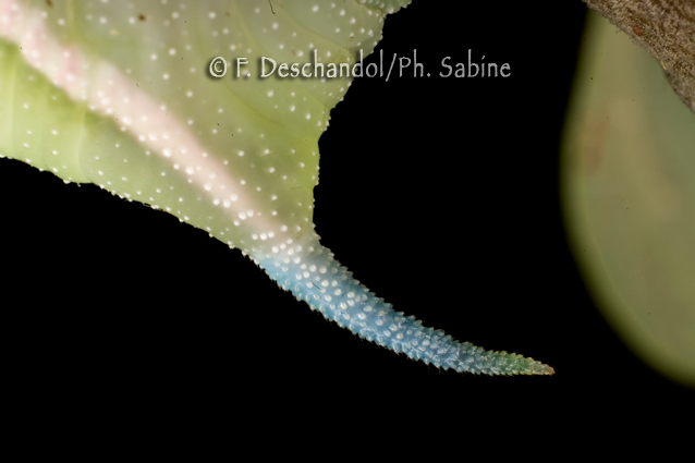 : Sphinx demi-paon (Smerinthus ocellatus ocellatus), chenille 5ème stade, détail du scolus, Treillières (44), France.