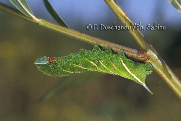 : Sphinx demi-paon (Smerinthus ocellatus ocellatus), chenille 5ème stade, Baie de Seine (76), France.