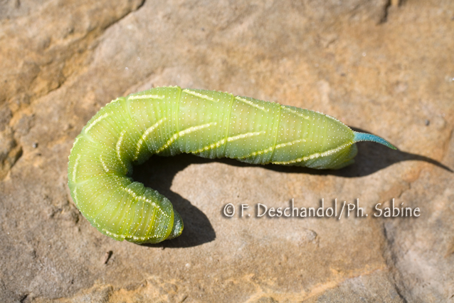 : Sphinx demi-paon (Smerinthus ocellatus ocellatus), chenille 5ème stade, nymphose proche, Vallée d'Hecho, Pyrénées, Espagne.
