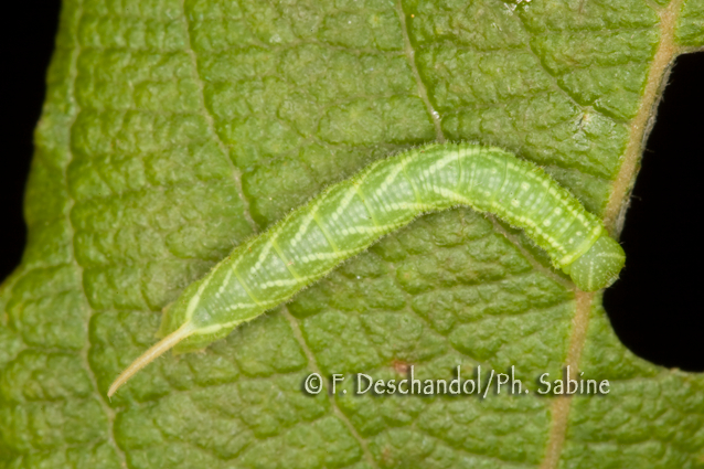 : Sphinx du Peuplier (Laothoe populi populi), chenille 1er stade, Magdeburg, Allemagne.